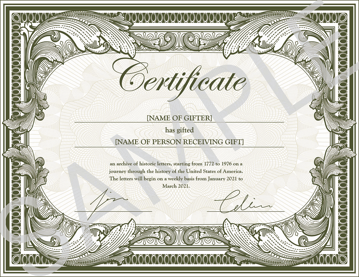 Need a last‑minute present? We got you covered. Send or print out and hand this certificate to your recipient today. It announces that a series of historic letters is on the way, sparking excitement long before the first delivery lands.